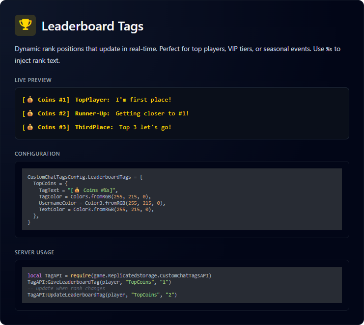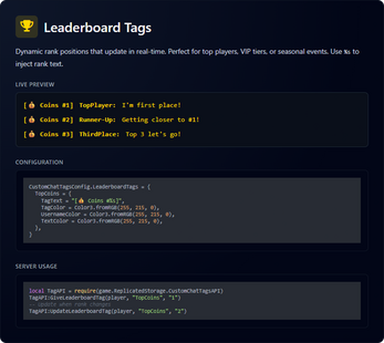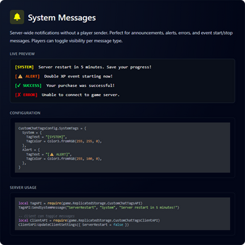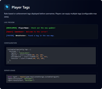 CustomChatTagsAPI– server tag managementCustomChatTagsClientAPI– safe client wrapperCustomChatTagsConfig– central configuration fileCustomChatTagsDataStore.server– persistence and cachingCustomChatTagsServer.server– remote handlers and updatesCustomChatTagsClient.client– rendering and formatting- Example scripts and a full README with setup and API docs